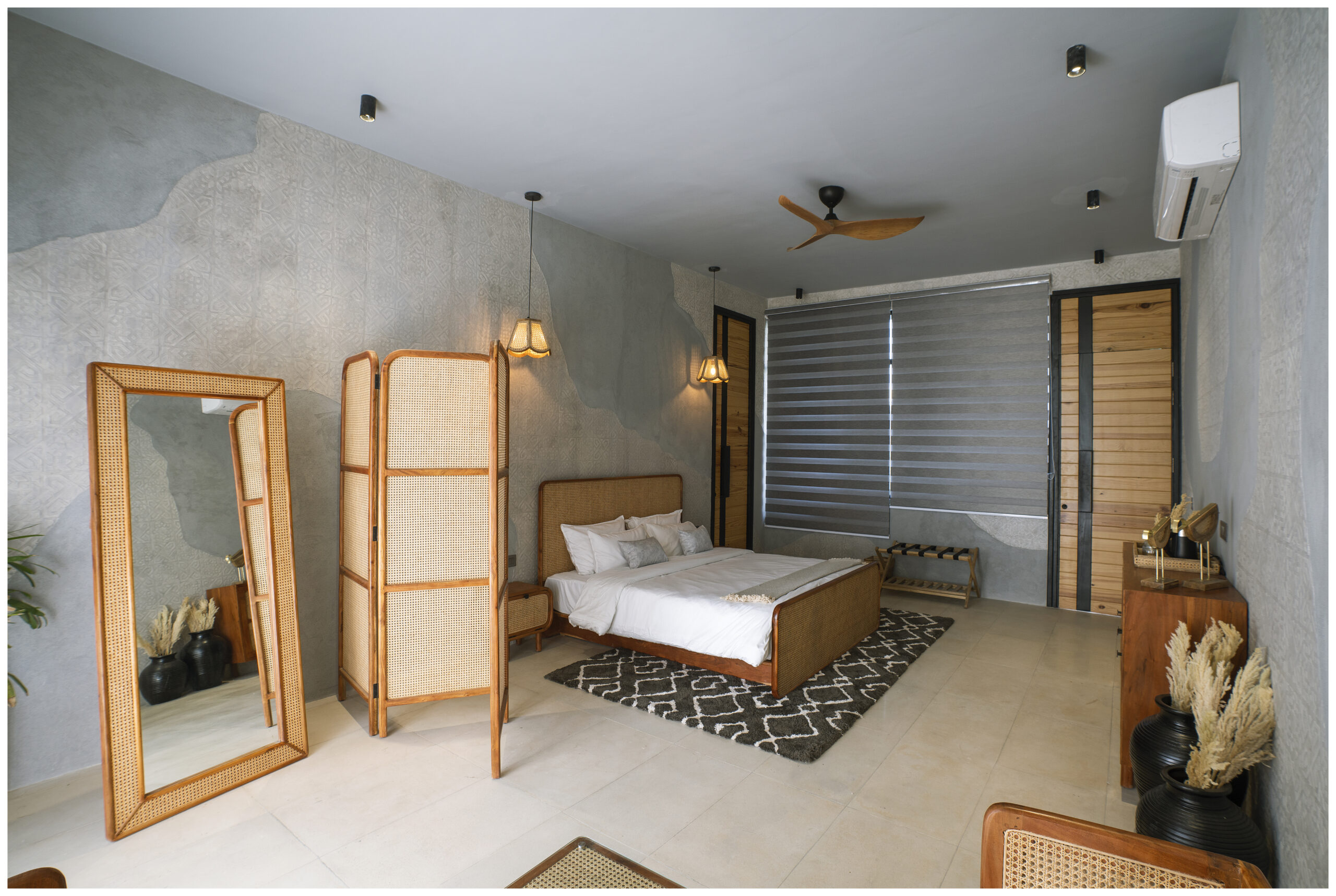 Step into the avant-garde realm of our Concrete Stamping-themed room at Casa Concreto, where artistry and comfort entwine to create a captivating and immersive experience. This unique space welcomes you with a visual feast of intricate patterns adorning the walls and flooring. Carefully stamped concrete elements serve as a bold and distinctive backdrop, setting the stage for a stay that celebrates artistic expression.Stylish cane furniture complements the graphic elements, striking a harmonious balance between modern aesthetics and comfortable functionality. The Concrete Stamping theme is not merely a visual statement; it’s a crucial part of the room’s identity. Every design element, from the stamped patterns to the carefully chosen furnishings, contributes to the seamless marriage of art and comfort. The result is a room that invites exploration and appreciation of its unique aesthetic while ensuring utmost comfort throughout your stay.