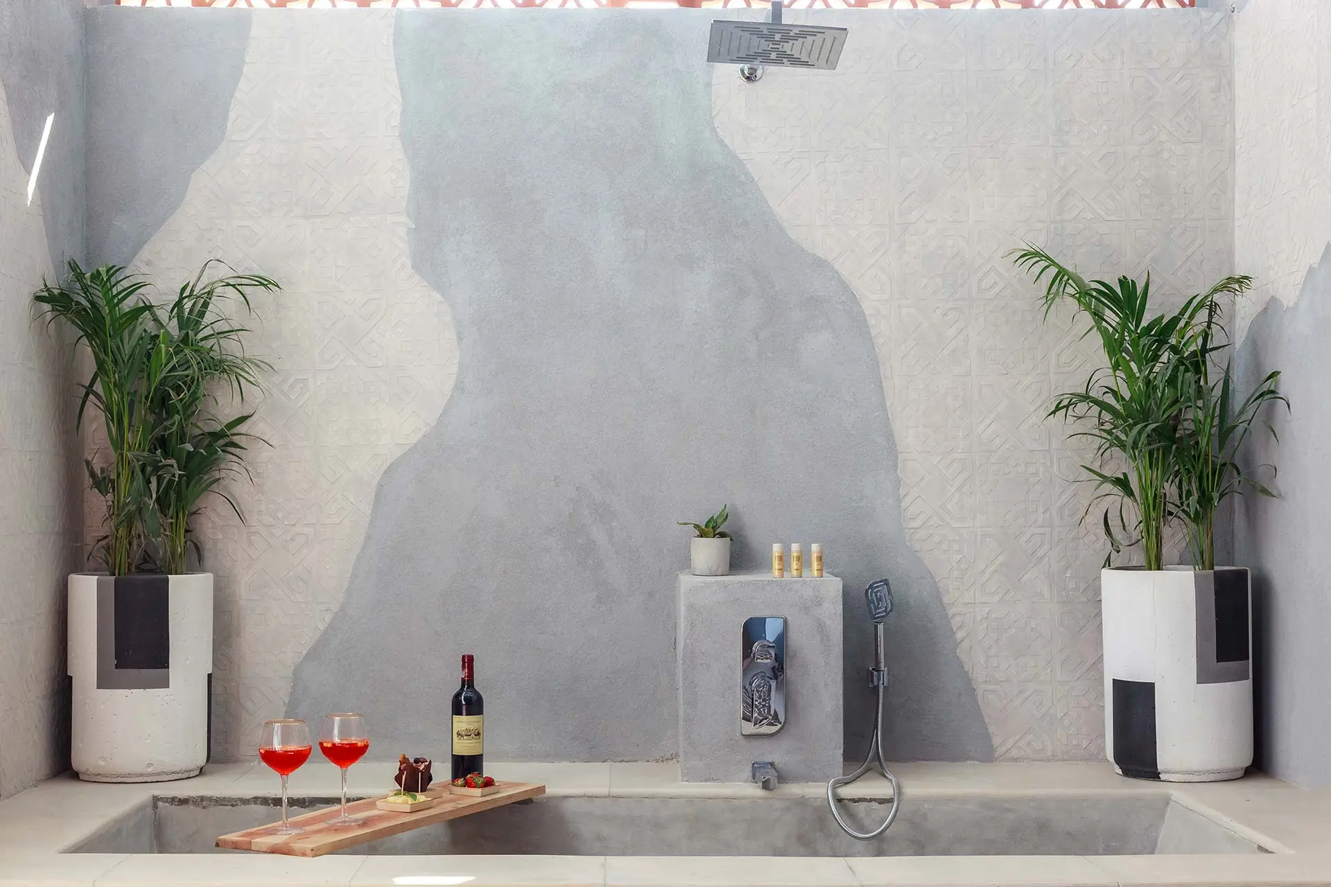 Experience an innovative bathing journey with our semi-outdoor shower which establishes a connection to nature while maintaining privacy. Indulge in the luxury of a concrete bathtub, a centrepiece seamlessly blending form and function. The smooth, cool surface invites you to immerse yourself in a relaxing soak, surrounded by the unique ambiance created by the stamped concrete walls.